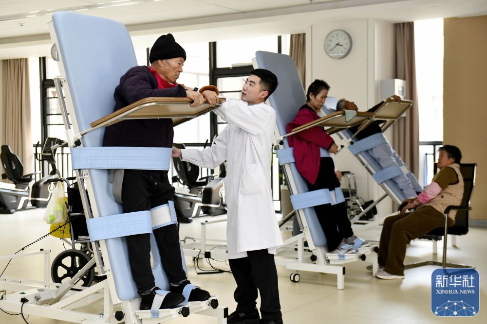 3月25日,在胶州市华福润养护院,护理人员协助老人进行益智训练。新华社发(王昭脉 摄)