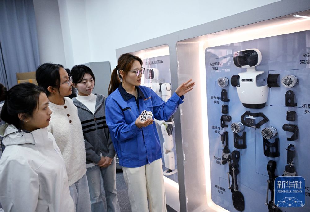 ↑ 3月26日,青岛职业技术学院老师陈静(右一)在课堂上讲解人形机器人结构。