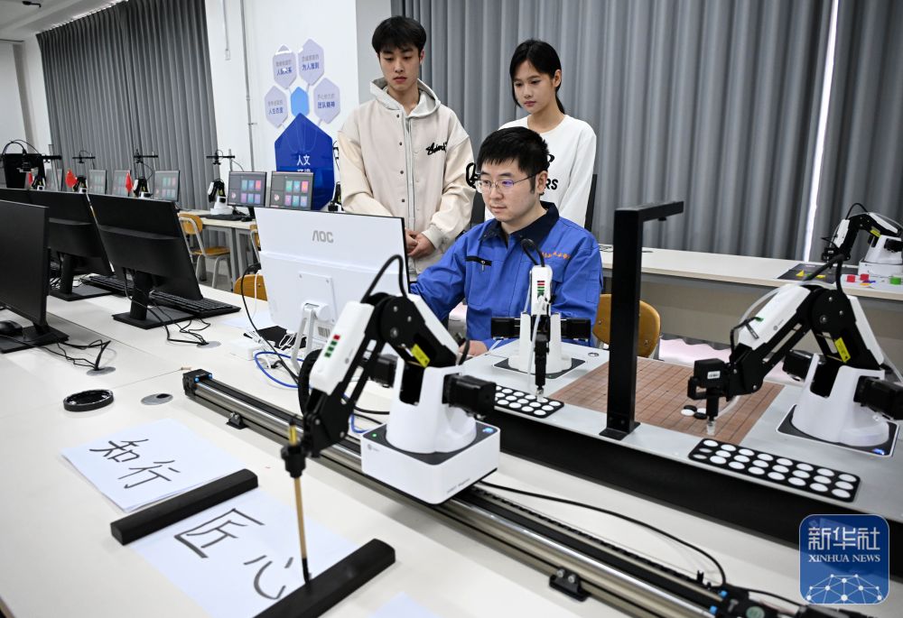 ↑ 3月26日,青岛职业技术学院老师刘德鹏(前)在课堂上演示机器人汉字书写。