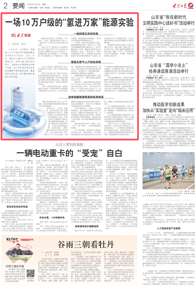 4月19日,山东潍坊,我国首个10万户级天然气掺氢规模化应用项目正式启动。从这一天起,潍坊中心城区10万户居民的厨房灶台,将用上掺入氢气的天然气,而居民们无需更换任何燃气设备。这个项目依托潍坊现有的城镇燃气管网基础设施,覆盖居民日常生活、商户餐饮等各类民生用气场景。