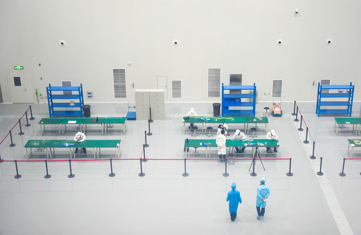 在济南卫星产业发展集团有限公司总装基地,工作人员在卫星生产车间工作(3月29日摄)。新华社记者 徐速绘 摄