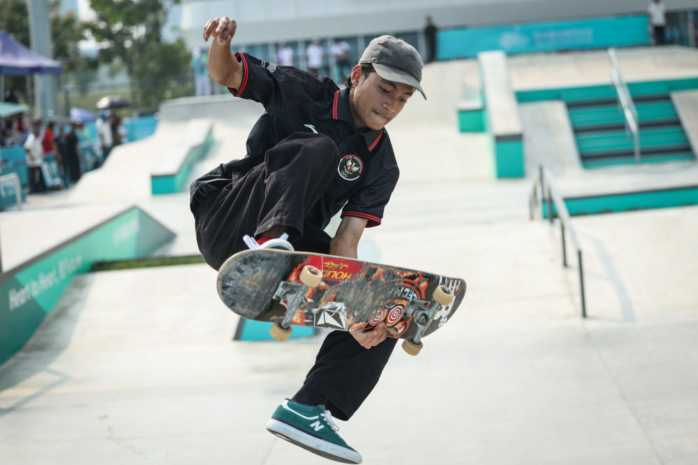 2023年9月27日,印度尼西亚选手桑古·达尔马·丹戎在杭州亚运会滑板男子街式决赛中。新华社记者 潘昱龙 摄