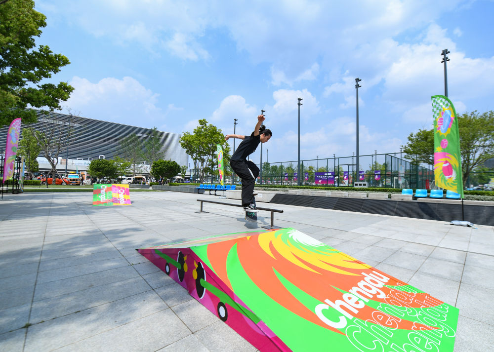 2023年4月19日,滑板爱好者在成都东安湖体育公园练习滑板。新华社记者 王曦 摄