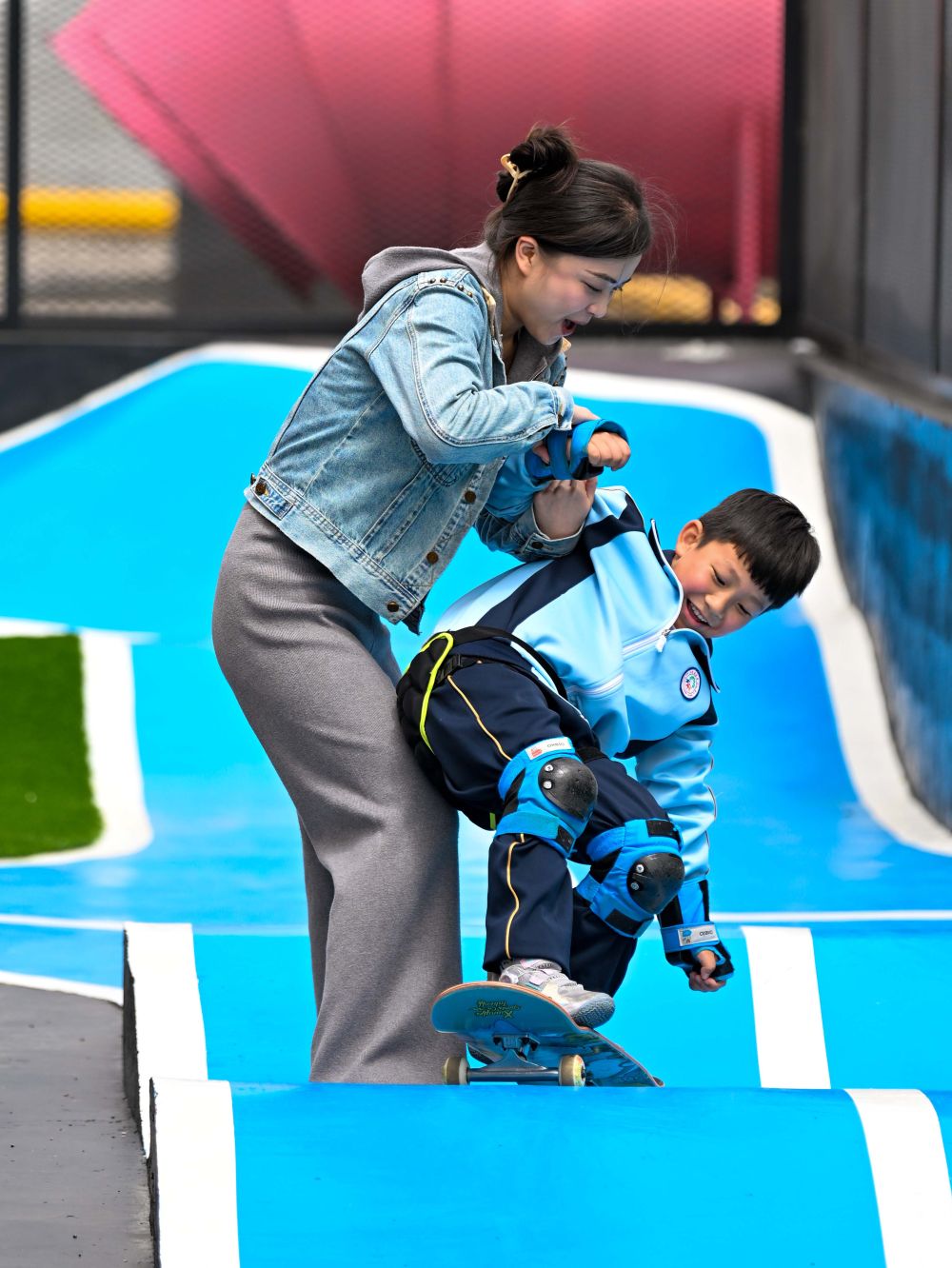 2023年4月28日,在天津中海环宇城购物中心楼顶滑板公园,小朋友在体验陆地冲浪板运动。新华社记者 孙凡越 摄