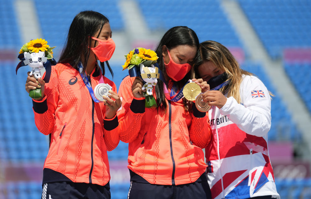 2021年8月4日,当时19岁的日本选手四十住樱(中)、12岁的日本选手开心那(左)和13岁的英国选手斯凯·布朗在东京奥运会滑板女子碗池比赛颁奖仪式上。新华社记者 李尕 摄