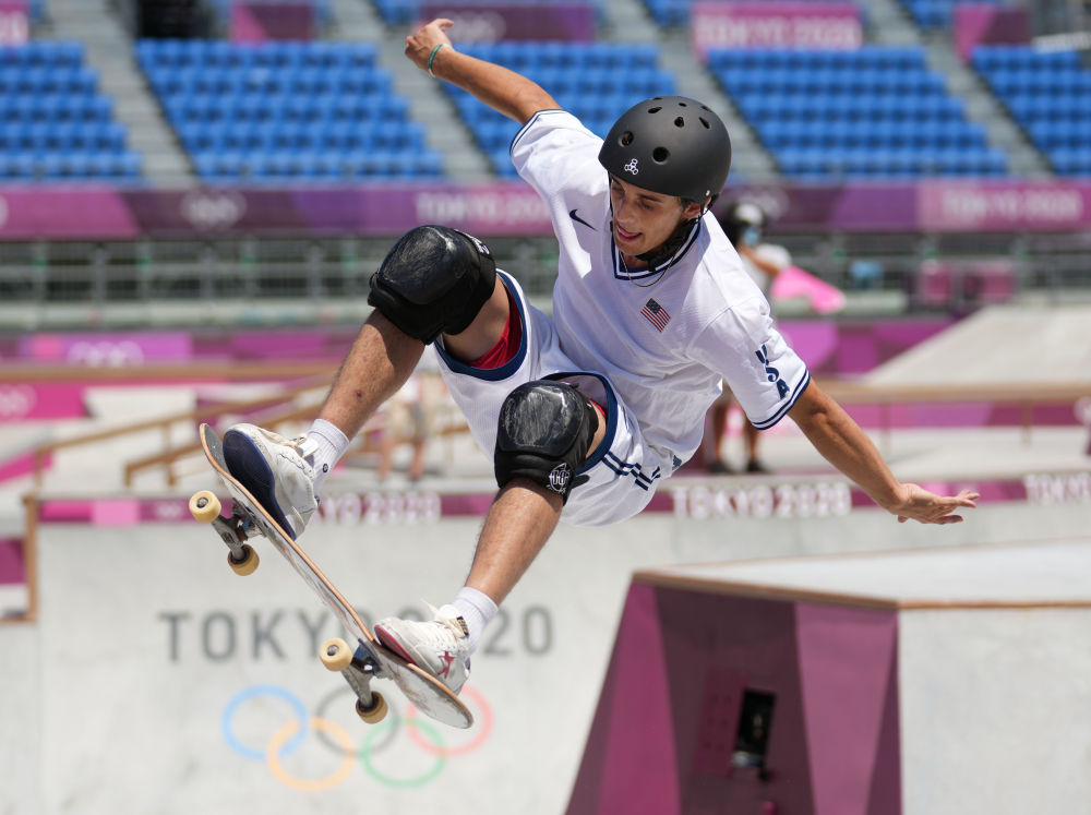 2021年7月25日,美国选手贾格·伊顿在东京奥运会滑板男子街式决赛后。新华社记者 薛玉斌 摄