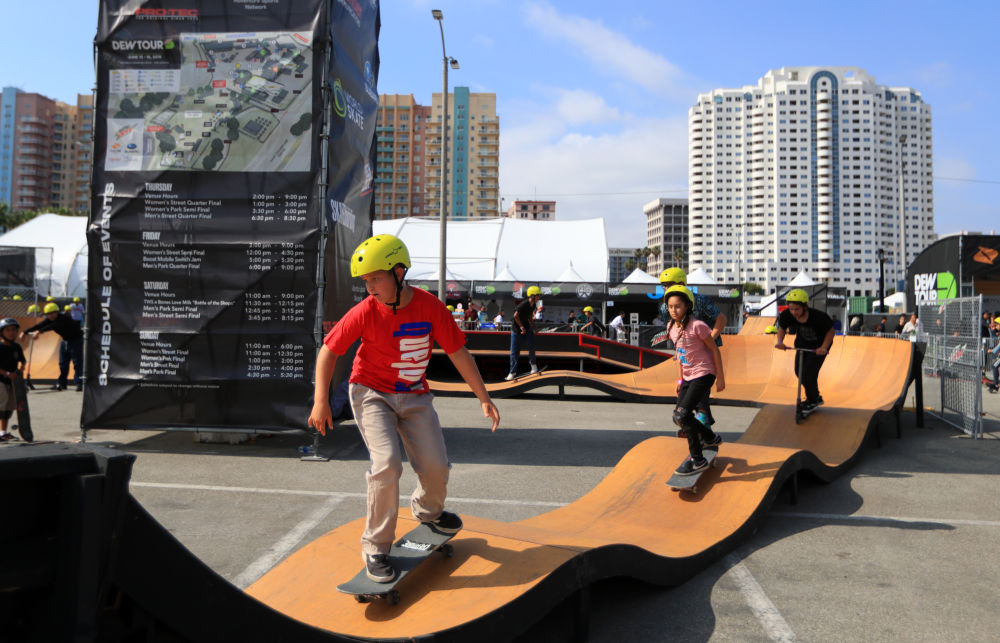 2019激浪滑板巡回赛在美国加利福尼亚州长滩举行,当地青少年在场地旁练习滑板(2019年6月16日摄)。新华社记者 李颖 摄
