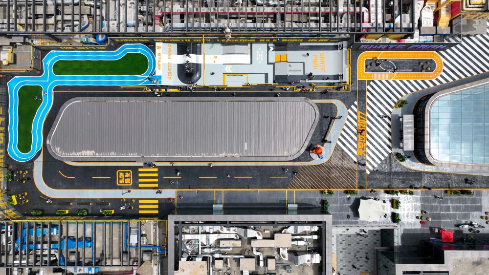这是2023年4月28日拍摄的天津中海环宇城购物中心楼顶滑板公园(无人机照片)。新华社记者 孙凡越 摄