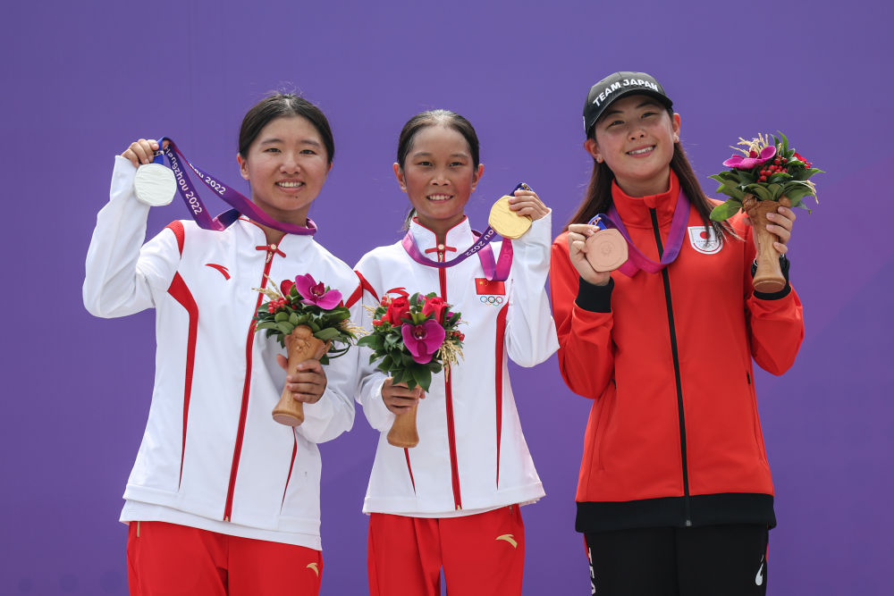 2023年9月27日,杭州亚运会滑板女子街式比赛冠军中国选手崔宸曦(中)、亚军中国选手曾文蕙(左)、季军日本选手伊藤美优在颁奖仪式上。新华社记者 潘昱龙 摄