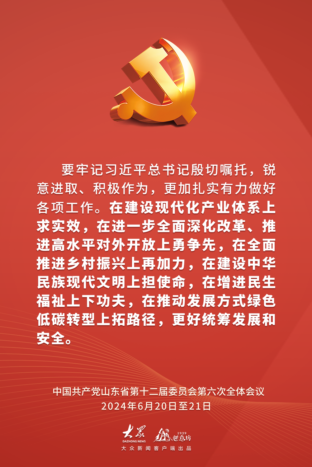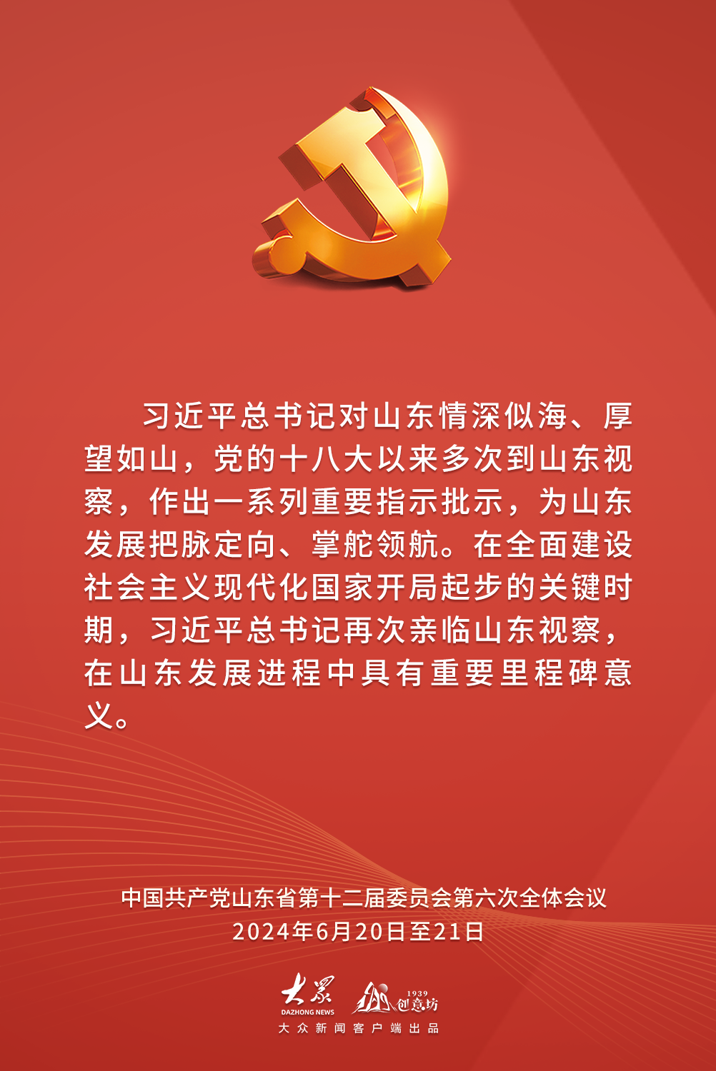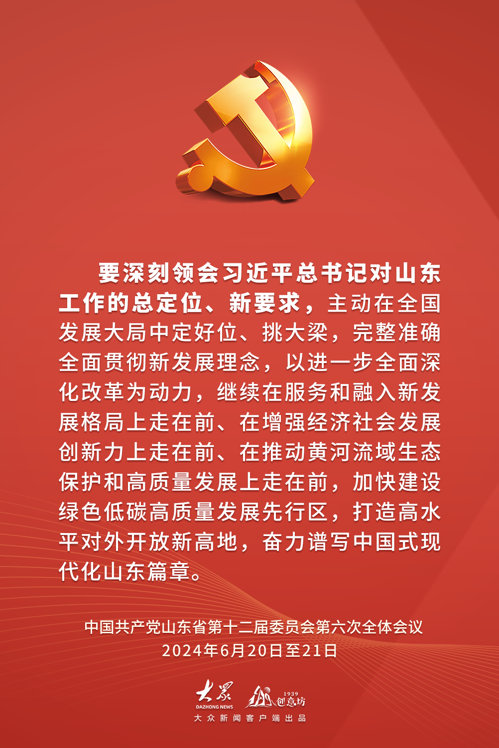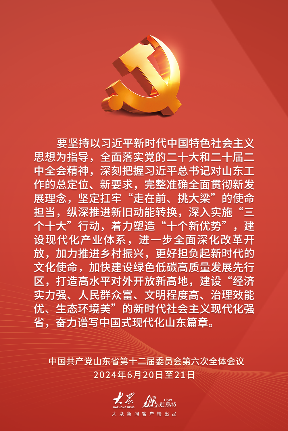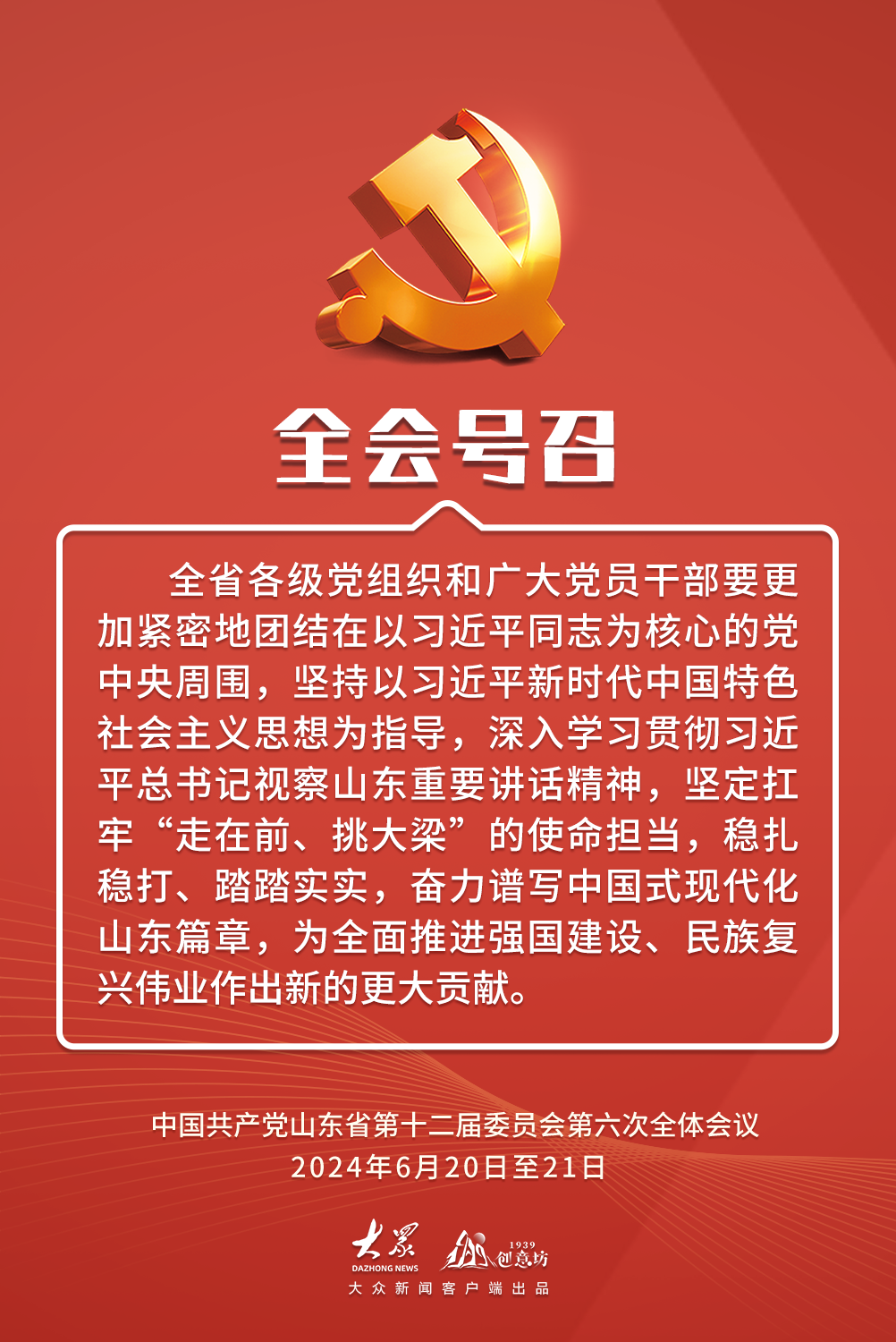 2024年6月20日至21日,中国共产党山东省第十二届委员会第六次全体会议在济南举行。全会以习近平新时代中国特色社会主义思想为指导,深入学习贯彻习近平总书记视察山东重要讲话精神,审议通过了《中共山东省委关于深入学习贯彻习近平总书记视察山东重要讲话精神奋力谱写中国式现代化山东篇章的决定》,审议了《关于全省党纪学习教育工作情况的报告》。全会有哪些内容?作出哪些具体部署?跟着大众日报·大众新闻客户端一起速览。