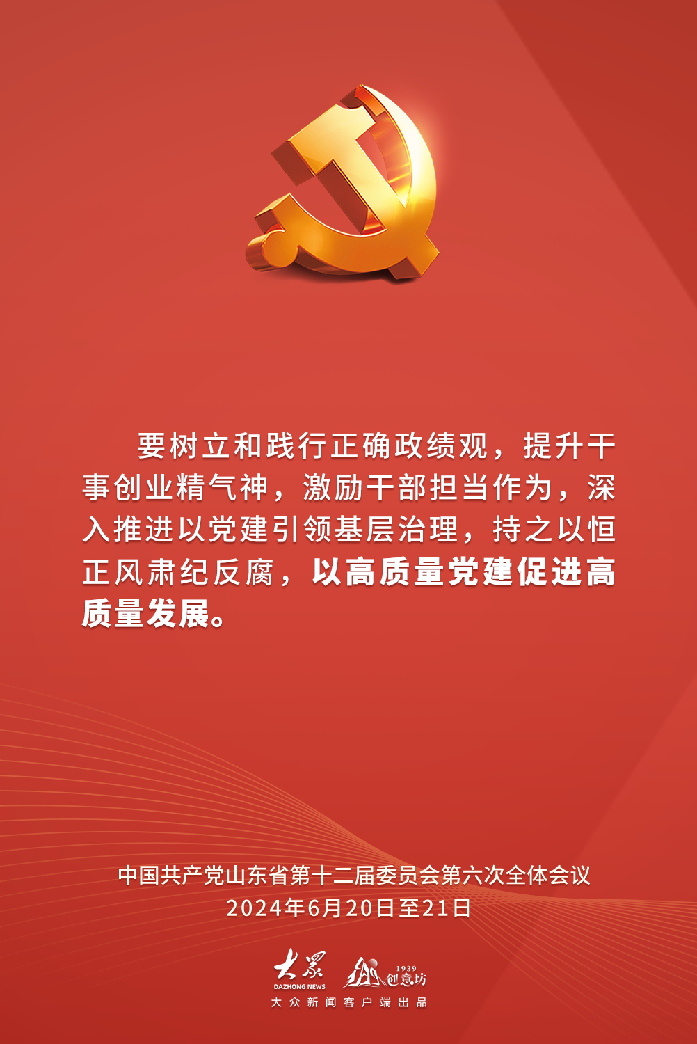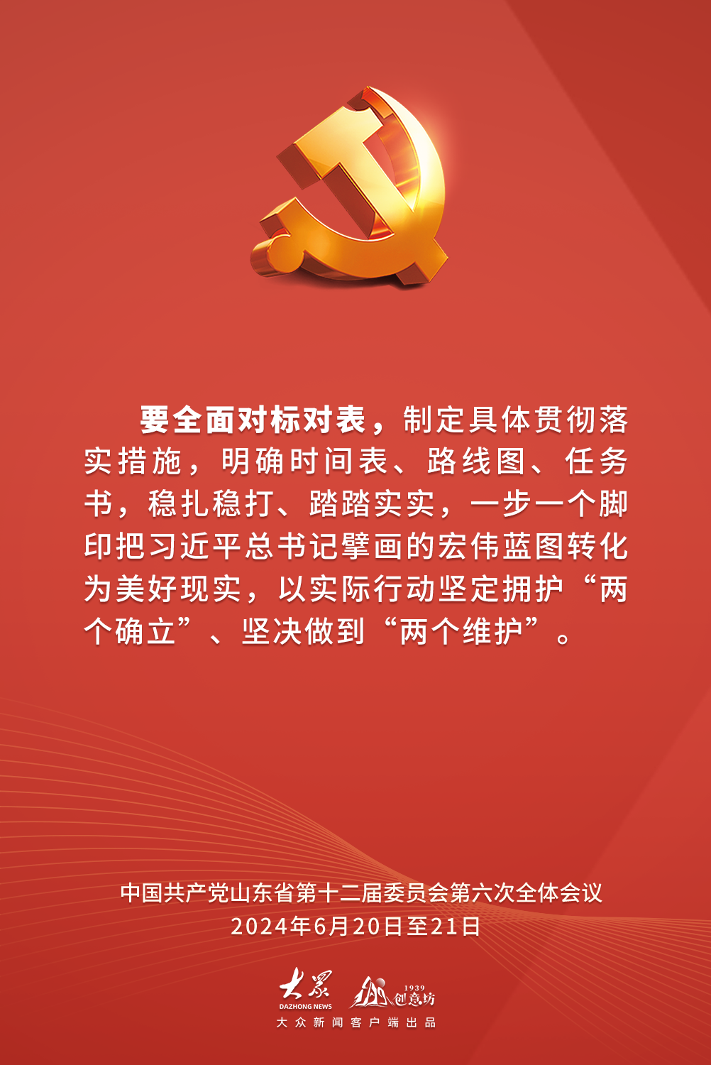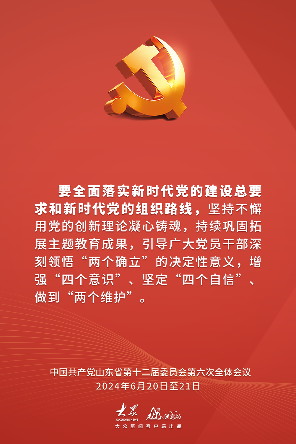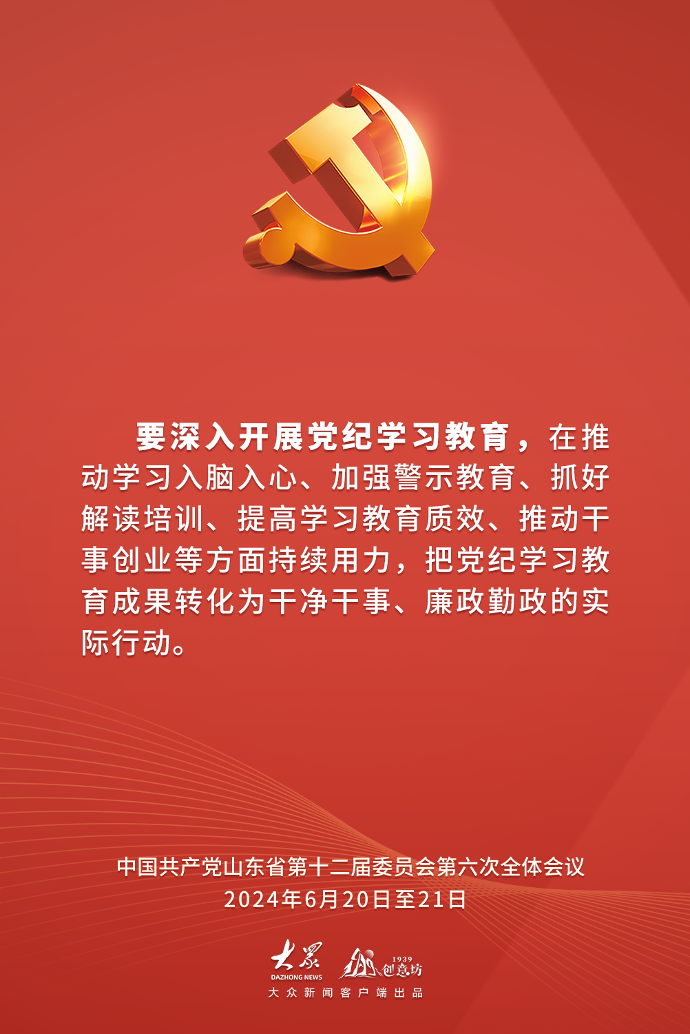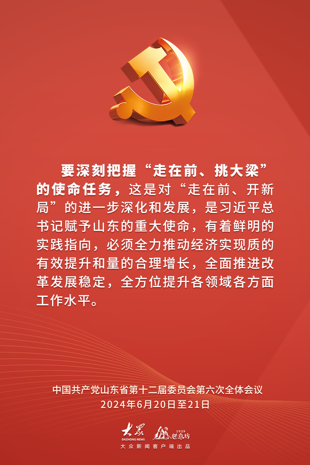 2024年6月20日至21日,中国共产党山东省第十二届委员会第六次全体会议在济南举行。全会以习近平新时代中国特色社会主义思想为指导,深入学习贯彻习近平总书记视察山东重要讲话精神,审议通过了《中共山东省委关于深入学习贯彻习近平总书记视察山东重要讲话精神奋力谱写中国式现代化山东篇章的决定》,审议了《关于全省党纪学习教育工作情况的报告》。全会有哪些内容?作出哪些具体部署?跟着大众日报·大众新闻客户端一起速览。