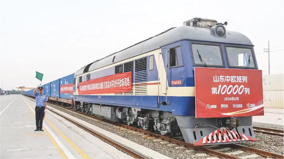 6月7日,山东开行的第10000列中欧班列从济南董家货运中心缓缓发出。山东坚持“政府引导、统筹整合、企业主体、市场运作”的原则,不断统筹整合、改革创新,将中欧班列打造成全省对外开放的新引擎和亮丽名片。(□记者 常青 报道)