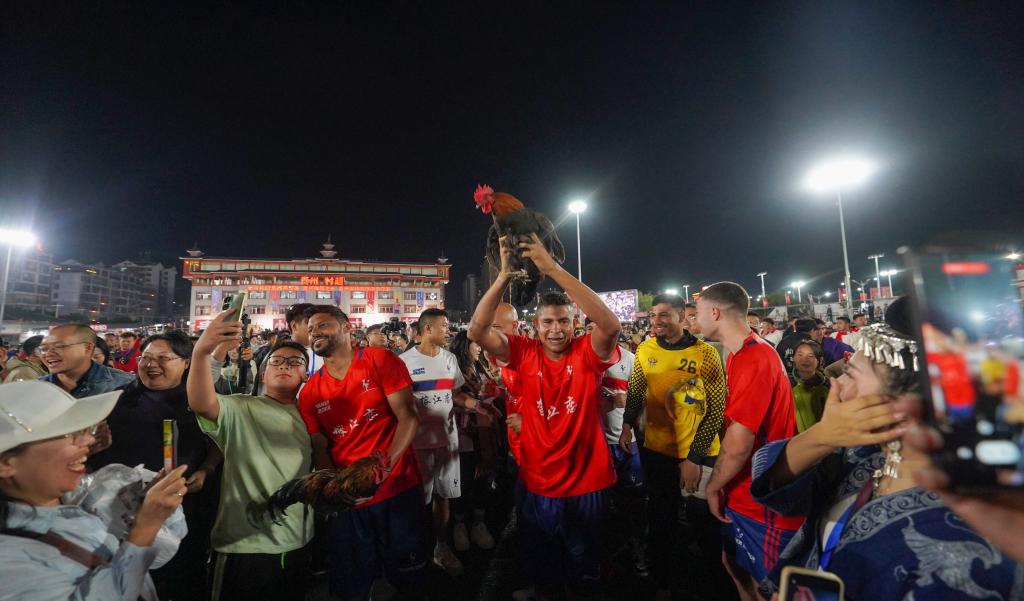 10月4日,在贵州“村超”球场,巴西圣保罗高桥足球队球员与现场球迷和游客互动。