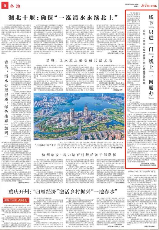 齐鲁网·闪电新闻10月30日讯今日出版的《新华每日电讯》在第6版以《线下“只进一门”,线上“一网通办”》为题,关注组山东“高效办成一件事”助力优化营商环境。文章提到,今年山东推出了19条深化“高效办成一件事”大力提升行政效能措施,从推进政务服务、企业群众诉求解决、机关运转、组织保障工作提质提效4个方面发力,进一步提升政务服务效能。