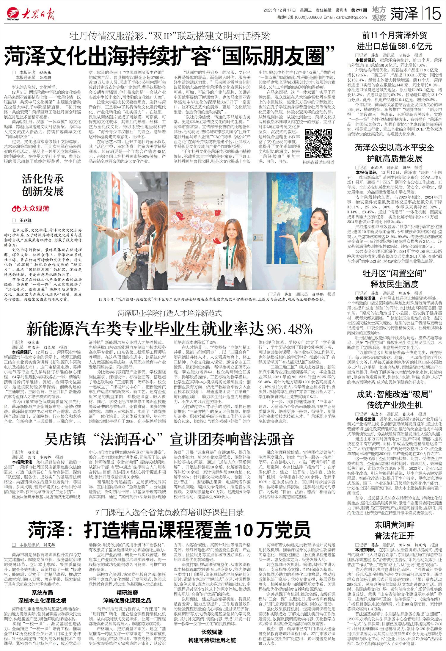 “从画中的牡丹到身上的汉服,文化已不再是静默的展品,而是融入时代、服务美好生活的活跃力量。”马来西亚雪兰莪州州议员梁德志高度赞赏菏泽将文化资源转化为可感、可触、可流传的产业与品牌,为讲述中国故事提供了鲜活案例,也为马来西亚青年感知中华文化的深厚魅力打开了一扇窗口。这不仅是艺术的展示,更是“文化赋能生活、创造价值的生动实践”。