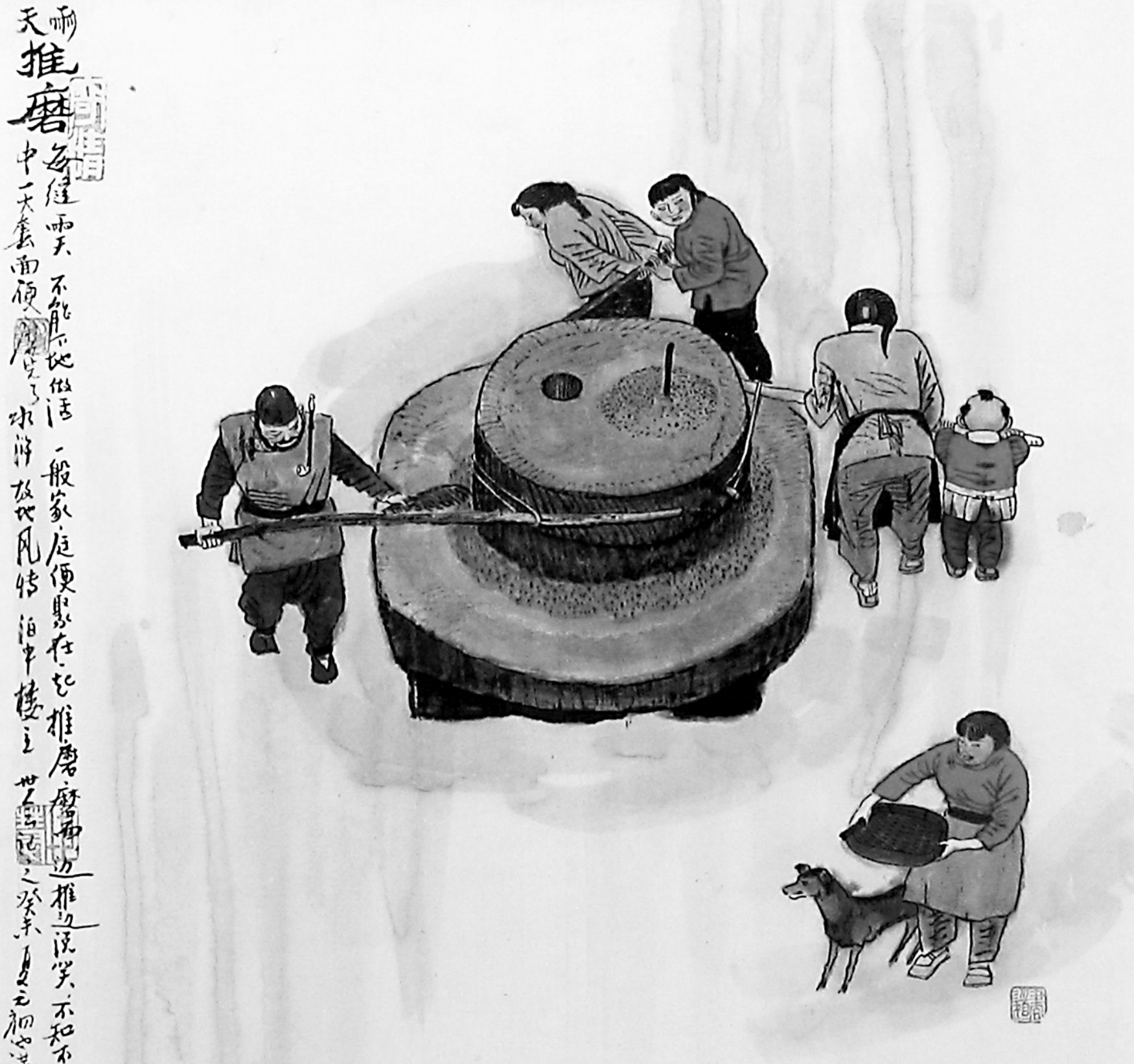 一到阴天下雨,地里没法干活,庄稼人便趁机赶紧推磨磨面。在没用上电磨之前,北方吃粮食要用石磨把粮食磨成面。这个过程很费力,有牲口的用牲口拉,没牲口的用人推。为哄小孩子推磨,大人会凑这个时间讲故事,说笑话,引得孩子们笑个不停,故事还没听够一晌就过去了,吃饭时才觉得腿又痛又酸。