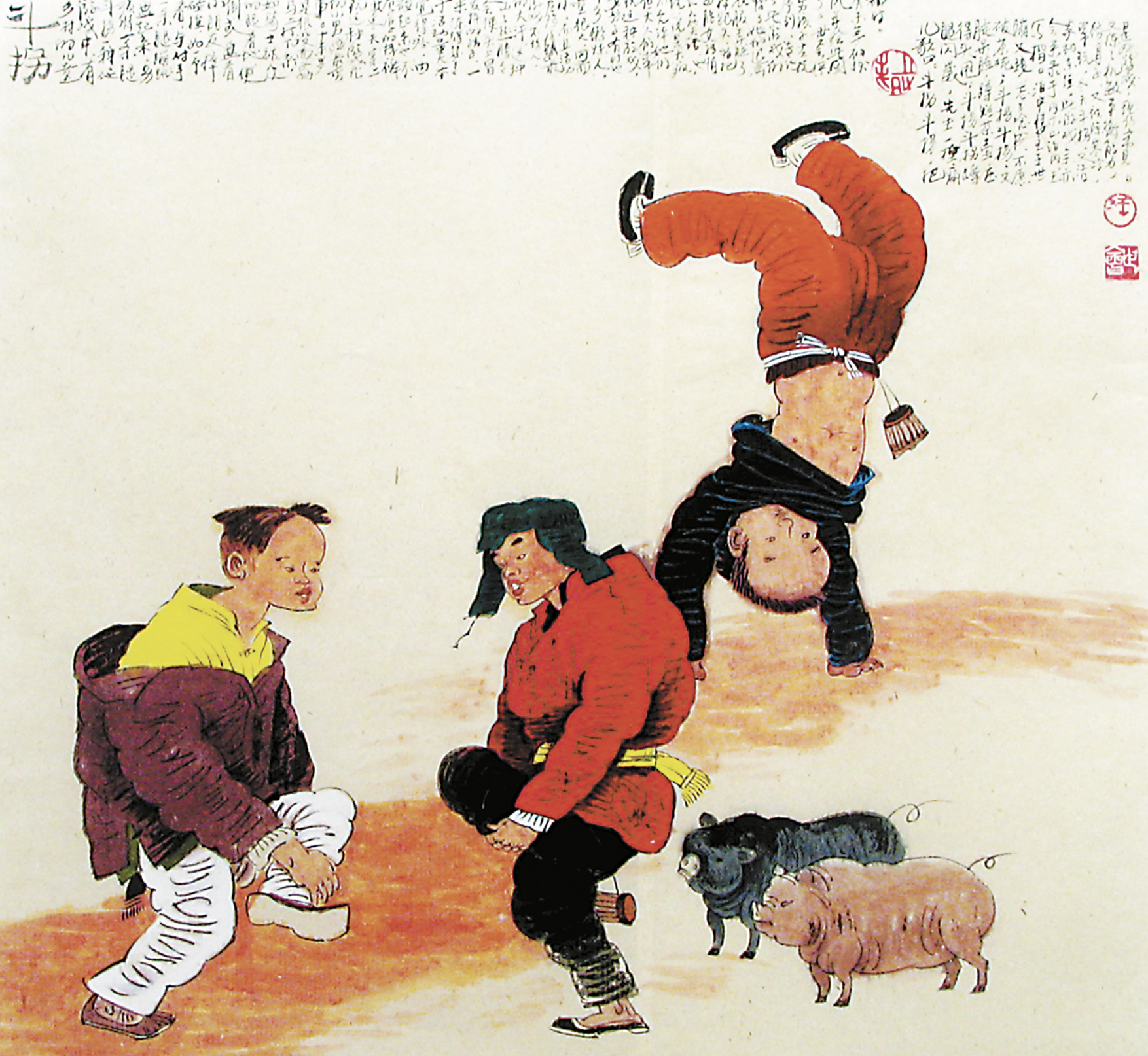 乡村儿童游戏中有一种游戏叫斗拐,又称撞拐,是以腿部为主要工具的竞技游戏,简单易行,充满趣味与活力。
