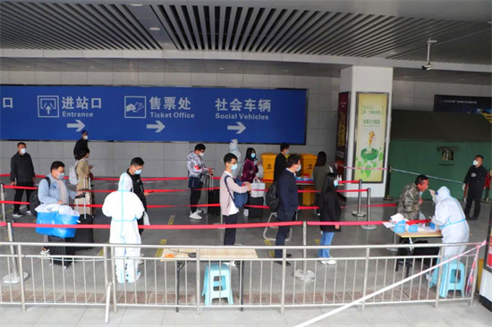 “五一”假期,菏泽火车站客流量迎来小高峰,作为菏泽重要的门户,菏泽火车站疫情防控专班承担着至关重要的任务。“为严格落实‘外防输入、内防反弹’的防控策略,切实保障广大旅客生命安全和身体健康,火车站疫情防控专班严格按照‘双码同查’的工作要求,严格管控和检查。”菏泽火车站疫情防控专班负责人张富生说,同时,在乘客出站口设有两个通道,通过健康码、行程码、体温测量等流程后,乘客还要在出口处进行免费核酸采样,严格做到来菏返菏人员“落地检”。