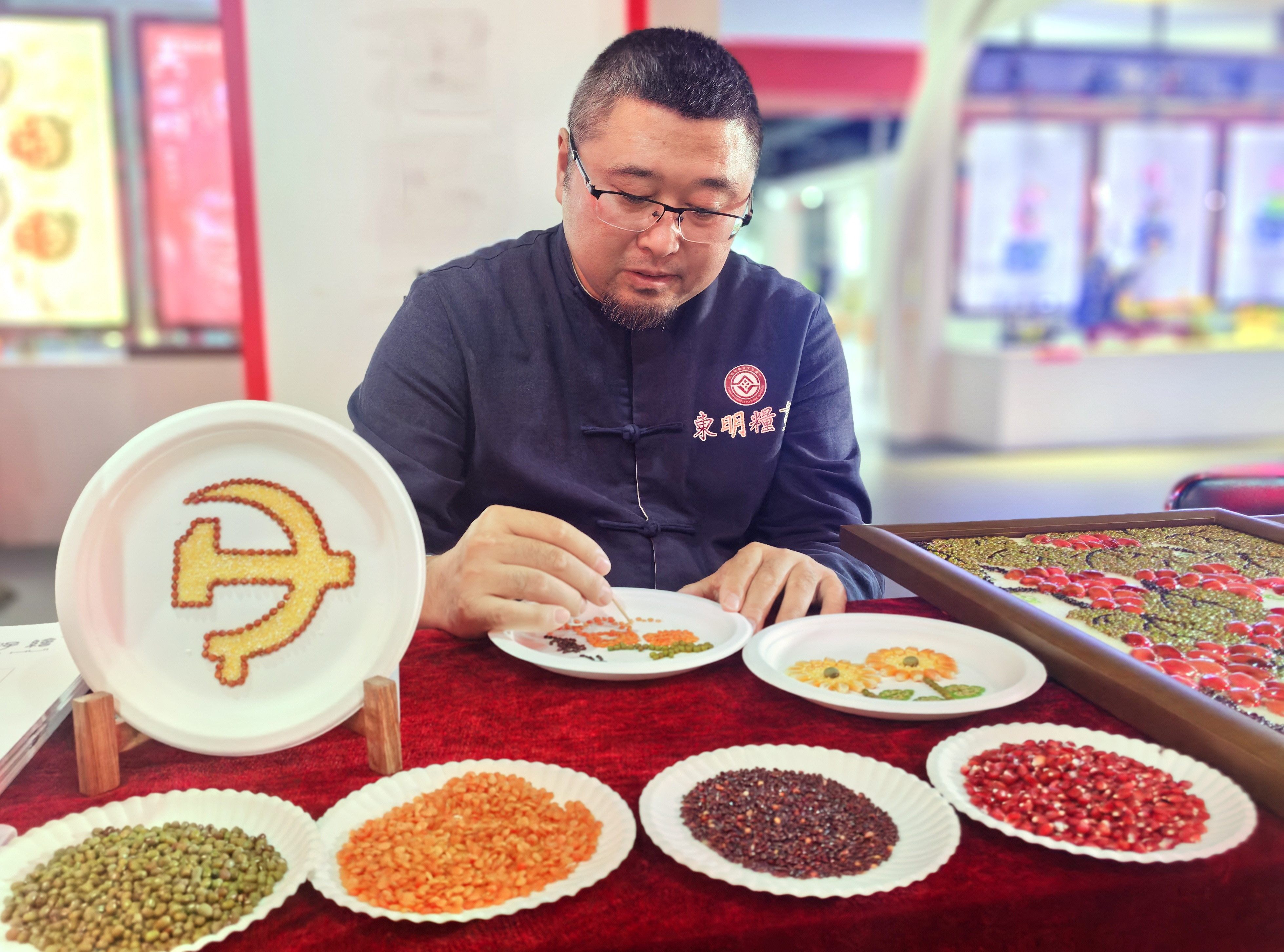 近日,在东明县武胜桥镇的一间工作室内,东明粮画非遗项目传承人韩国瑞正在创作粮画作品。据悉,东明粮画历史悠久,主要是利用五谷杂粮天然的颜色和形状,进行巧妙的拼粘,做成各种吉祥美好的图案,应用于节庆或者祭祀活动。为了让粮画顺利走进大众的视野,韩国瑞在传统粮画防腐技术的基础上,融合现代科技,使得粮画能够保存两百多年,从而使其走进了千家万户,成为可以摆放的艺术品。