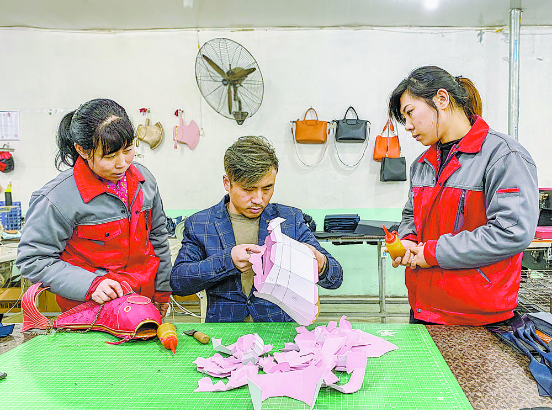 “张师傅每天就是教我们打版、下料、打斩、缝制,到成品要十几道工序。要想让一张原始而完整的皮料,蜕变成一件件精致完整的作品还需要精细的眼里劲。”在这里做学徒的丁红霞告诉记者。