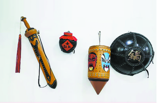 在展厅的北侧,墙上挂满了他的皮质工艺品,根据形状,他把作品命名为屠龙刀包、鲤鱼包、脸谱包……