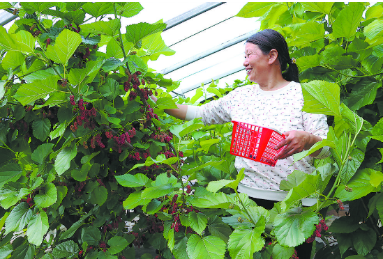 日前,在牡丹区胡集镇尚尧农科园大棚内,村民在采摘桑葚。该园60多座日光大棚内,草莓、桑椹等成熟上市,前来采摘的游客络绎不绝。近年来,胡集镇着力发展生态高效农业,乡村采摘游十分红火,农民专业合作社、家庭农场、种植大户等日益增多,成为带领村民增收致富的新引擎。