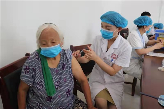 “大娘,别紧张。打防疫针不疼。”这是定陶区张湾镇中心卫生院的护士董俊叶,近日给耿家村87岁老年妇女刘付阁打第二针防治新冠肺炎疫苗时的情景。