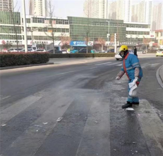 1月13日,牡丹区环境卫生服务中心组织环卫工人对西安路上结冰路面播撒融雪剂,缓解交通压力,进一步方便群众出行。记者 孟 冰 摄