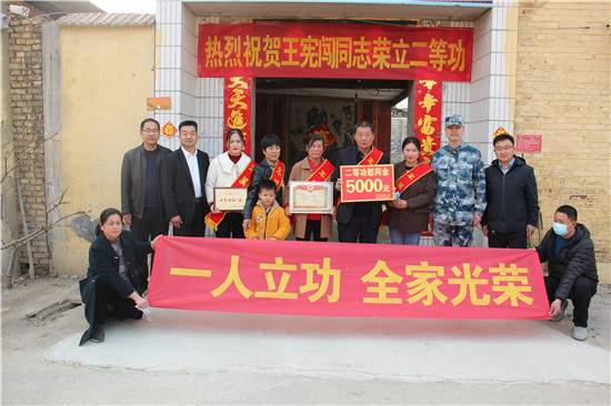 3月22日下午,成武县人武部、县退役军人事务局及文亭街道办事处相关负责人一行,将一份二等功喜报和慰问金送到了该街道张陈庄现役军人王宪闯家中,与军属共享这份荣耀和喜悦。