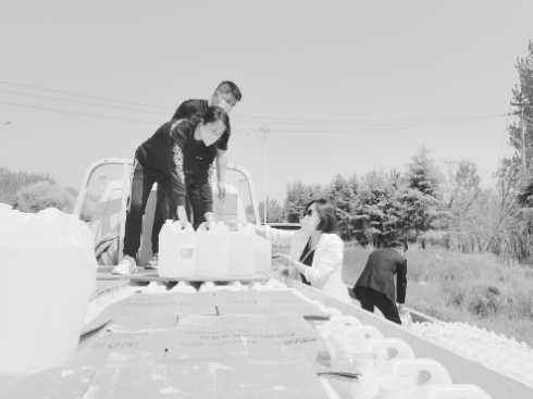 “一桶,两桶……300桶!都卸这里了。”程鑫一边接听电话一边卸货。这时路边已经整整齐齐摆放了300桶84消毒液。
