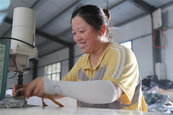 “70后”的周东宁是个地地道道的农民,丈夫是个电焊工,她在家里种着4亩地,照顾2个孩子上中学。两年前村里办起了箱包厂,周东宁闲暇之余就去箱包厂上班。“村里妇女平时就做针线活,再经过老师指教,很快就能上手。”周东宁在三合村箱包厂流水线上熟练地加工着手提箱包,身旁摆放整齐的半成品便是她上午工作的成果。“我算是最早的一批员工了,现在已经比较熟练了,上个月到手工资4500元。”说话间,周东宁露出了农村妇女特有的质朴笑容。