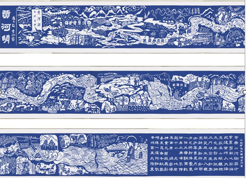 本届博览会上,菏泽市郓城县将《黄河情》剪纸作品带到现场。作品以剪纸长卷形式,用传统的剪纸元素及阴阳结合技法,剪制描绘出沿黄九省区的黄河文化和地域景观。