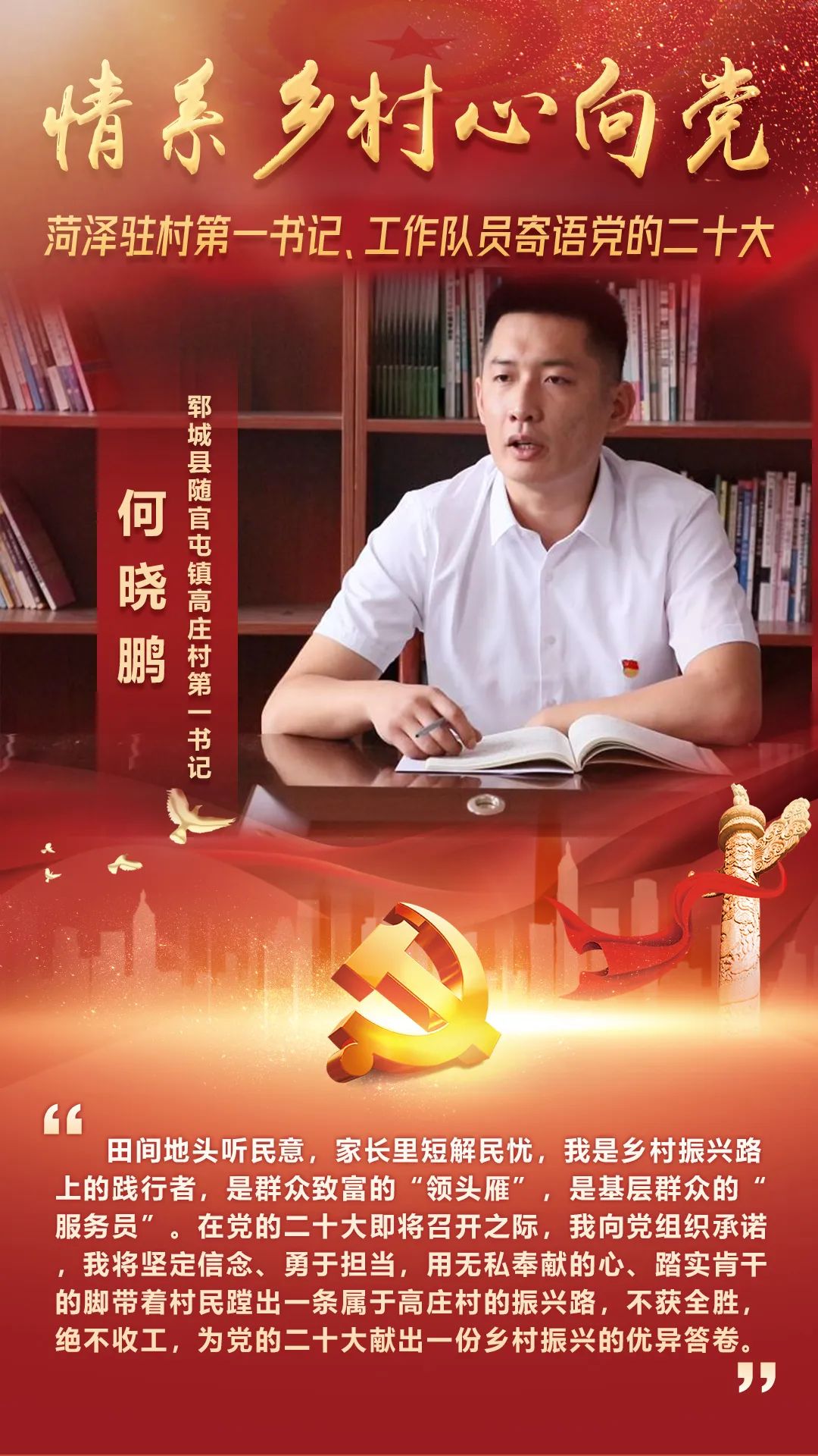 在党的二十大即将召开之际,我向党组织承诺,我将坚定信念、勇于担当,用无私奉献的“心”、踏实肯干的“脚”带着村民蹚出一条属于高庄村的振兴路,为党的二十大献出一份乡村振兴的优异答卷。