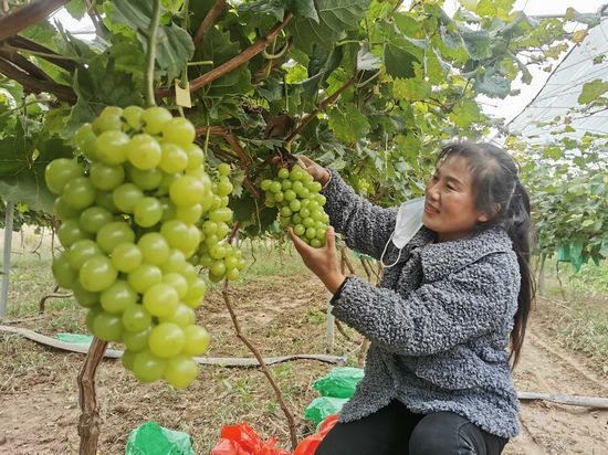 10月20日,在郓城县唐庙镇胡庄村,果农正在大棚里查看葡萄成熟情况。据悉,胡庄村是山东省农科院重点对口帮扶的一个葡萄专业村,目前全村种有高档晚熟阳光玫瑰葡萄近300亩,由于该品种晚熟、高糖、口感好、耐于储存,2021年初次挂果亩收益高达2万多元,良好的收益带动了周边村庄群众种植阳光玫瑰葡萄的积极性。