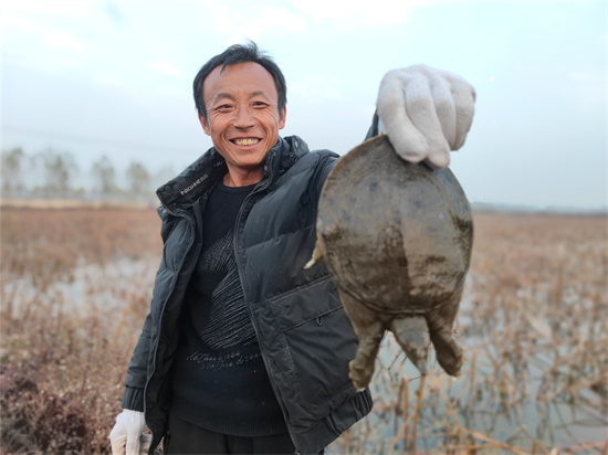 “荷塘里过几天就开始收藕,收藕的同时也开始捕获甲鱼,一塘多收。”1月8日,在东明县黄河生态种植基地荷塘旁,工作人员向记者展示刚刚捕获的甲鱼。据悉,该基地种植了莲藕1000余亩,同时发展荷塘养甲鱼的生态养殖模式,亩均年产值近3万元,带领百姓走出了一条特色生态养殖的致富路。