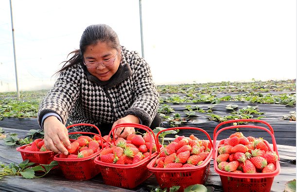 1月11日,在定陶区张湾镇户集行政村的草莓大棚里,种植户董胜利和妻子正在采摘草莓。春节临近,水果市场开始火了起来,为卖出最好的价格,董胜利和妻子这段时间天天在大棚里采摘。“俺的草莓主要对接超市和批发站,根本不愁卖!随着春节临近,散户订购逐渐多了起来,草莓价格也比超市和批发站高很多,我们已把目标盯准了春节市场。”董胜利说。