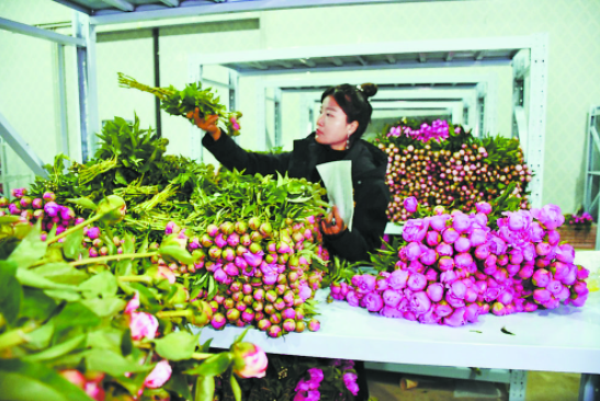 赵文双在自身事业成功的同时,也不忘帮扶乡亲共同致富。“活不累,挣得多!”在芍药冷库生产车间,花农韩爱凤手持尺子和剪刀,干净利索地剪出长短同等规格的芍药,码放整齐后,再送往预冷车间。韩爱凤掰着指头,算了一笔账:家中4亩地流转给基地,地租一年将近5000元;在这里打长工每天近100元,一个月有近3000元的收入,一年收入4万余元。
