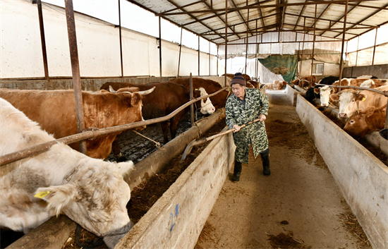 近日,在鄄城县董口镇前园村利民畜牧养殖专业合作社,工人正忙着加工饲料、添草喂牛。在前园村,众多村民发展特色养殖,越来越多的群众通过产业带动走上致富路。