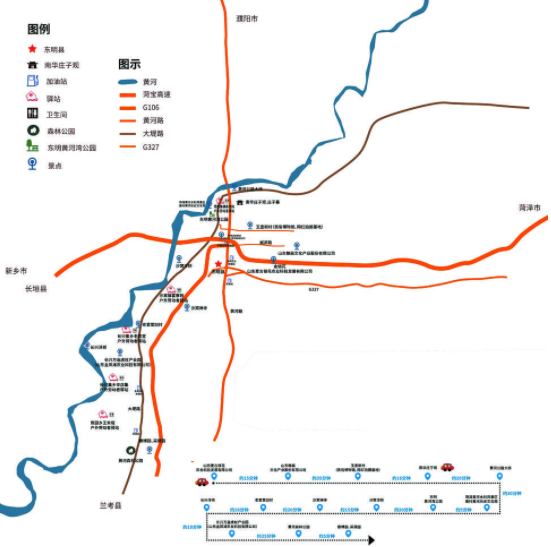 据悉,沿黄旅游攻略图以民俗文化、园林景观、农业采摘、非遗文化、宗教文化、产业园区、地理景观等方面为重点,精心筛选了东明县具有代表性的旅游景点20余处,通过地图对东明县沿黄线路上的自然风光、人文景观等进行标注,充分展现了黄河入鲁第一县的风光。此外,地图还标注了加油站、高速口、黄河浮桥等位置信息,其中从高速口到大堤公路、从市区到大堤公路两条线路为主打路线,景点与景点之间的距离和花费时间都一目了然,就连市总工会联合东明县总工会倾心打造的户外劳动者驿站也标注得一清二楚。广大职工群众和游客带家人到东明县领略“母亲河”风光,可以通过地图合理地规划出行时间和线路。