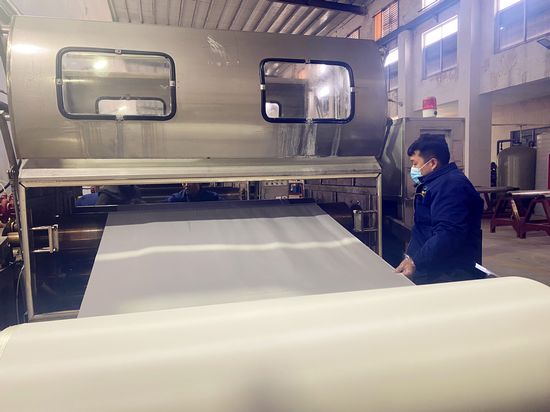 3月22日,定陶区嘉泽电子材料有限公司生产车间内,工人正在给电子基布进行上浆。据了解,该公司主要生产超薄、具有高吸附力的电子基布,属于高端纺织企业。目前一期已经建成投产,项目二期建成达产后预计年销售达到10亿元。记者 孔博 摄