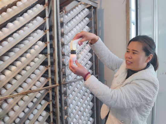 3月22日,单县东城街道高家庄村金满田合作社孵化车间,工作人员正在查看种蛋发育情况。据了解,高家庄村依托党支部领办合作社,统筹本村资源,打造农资车间、鸡蛋加工厂以及青山羊养殖项目,解决了剩余劳动力的同时,村集体经济收入大幅增长。记者 李保珠 摄