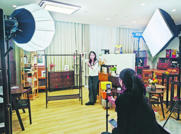 日前,鲁西新区“江北V谷”园区,入孵企业山东睿帆工艺品有限公司主播正通过直播的方式销售产品。据了解,“江北V谷”按照孵化器的定位规划,以“文化+科技”为发展方向,文化创意为核心,高新技术为支撑,聚焦数字视频内容生产、技术服务等领域,致力于打造长江以北最大的文化科技产业集群,让“江北V谷”成为新地标。园区立足自身优势,为入孵企业提供办公场地、技术服务等,助推企业实现高质量发展。