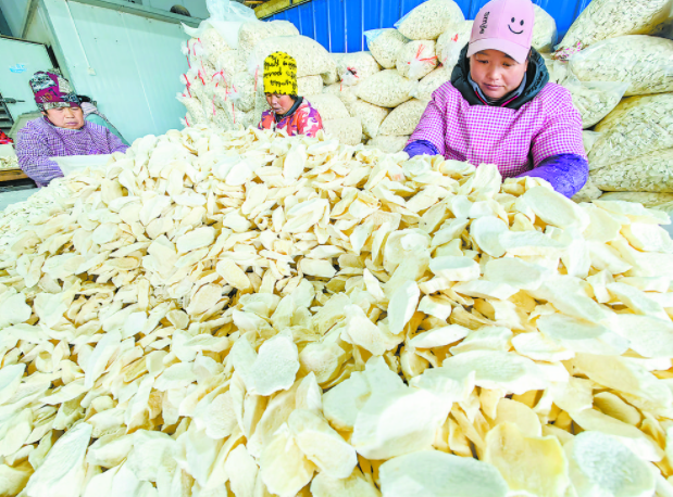 3月24日,在牡丹区小留镇吴油坊村一处山药加工车间,村民在分拣山药片。近年来,小留镇大力发展山药产业,引进相应的农副产品深加工企业,研发生产的山药片、山药粉、山药面等系列产品畅销市场。去年,仅吴油坊村的山药销售额就超3亿元,村民累计劳务收入3000余万元。