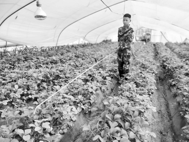 一位身着迷彩服、肤色黝黑的年轻人,在这群忙碌的人群里特别显眼,他就是退役军人马俊强。别看他年纪不大,却有着丰富的草莓种植经验,还是天润高效产业园里的技术“骨干”。