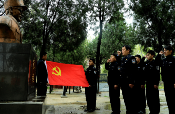 日前,曹县公安局邵庄派出所民辅警来到烈士陵园,开展祭奠和缅怀先烈活动,接受革命传统教育,表达对革命先烈的哀思之情和崇高敬意。图为民辅警在烈士墓前重温入党誓词。