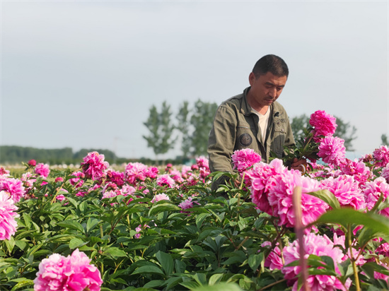 5月11日,在鄄城县彭楼镇吕庄村芍药种植基地,村民们正在田间采收、打捆芍药鲜切花。据了解,该基地种植芍药面积130余亩,有银边红阁、迟粉、杨妃出浴、桃花飞雪等30多个品种,依托当地资源优势,结合线上线下两种销售模式,在大力发展芍药鲜切花的同时带动周边群众增收,助力乡村振兴。记者 毛慎沛 李保珠 摄