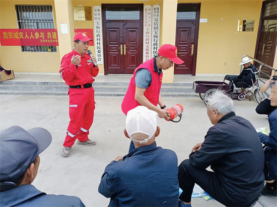 近日,在牡丹区吴店镇宝庙行政村,菏泽市牡丹紧急救援中心志愿者正在为群众讲解示范防火防震、防溺水、家庭急救等基础知识。日前,市应急管理局联合菏泽市牡丹紧急救援中心开展“平安家园”项目活动,宣传普及防火防震、防溺水、家庭急救常识。记者 毛慎沛 摄