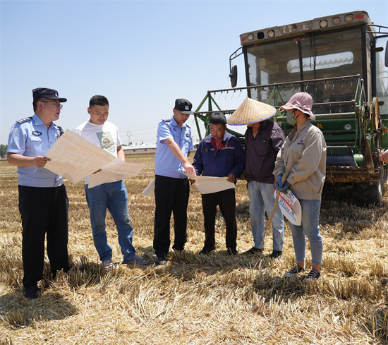 近日,成武县公安局党集派出所民辅警深入田间地头开展“护麦入仓”行动,宣传小麦防火、麦秆禁烧等内容。在此次行动中,民警向群众面对面讲解安全防范知识,切实提高人民群众安全意识,为麦收生产保驾护航,用实际行动守住辖区群众的“丰收成果”,全力确保平安麦收,颗粒归仓。通讯员 孔令乾 刘志远 摄