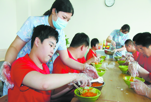 7月11日,特殊儿童在巨野县残疾人康复中心托养区康复师的指导下学习生活技能。特殊儿童托养提供24小时全方位的生活照料及护理,减轻特殊儿童家长时刻陪护压力的同时,也培养儿童生活自理和社会适应能力。据悉,我市残疾人服务设施建设扎实推进,今年成武县、鄄城县康复中心、巨野县托养中心等3个项目相继投入运行,其他4个项目也全部进入验收阶段。康复训练残疾儿童3394人,服务率已达94.9%,创历史最好水平。同时充分发挥爱心单位、公益组织作用,实施了脑瘫儿童救助、白内障手术等一批康复救助项目,为残疾人减免费用280余万元。