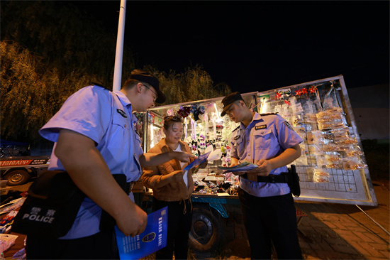 近日,曹县公安局青菏派出所民警深入辖区夜市开展防诈宣传活动,通过发放宣传资料和案例讲解等形式,向群众宣讲诈骗知识和诈骗分子的常用手法,提醒群众守护好自己的“钱袋子”。 图为9月7日,民警在夜市向群众宣传电诈知识。